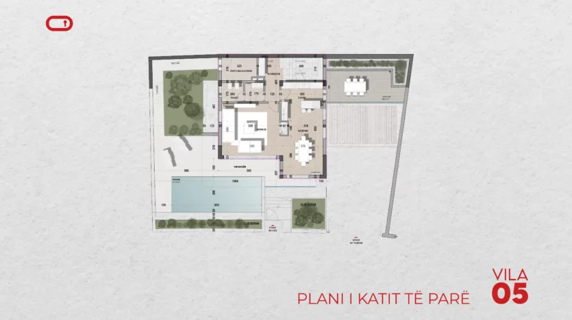 - Sallon open space me dalje në verandë e pshine dhe kopsht privat.