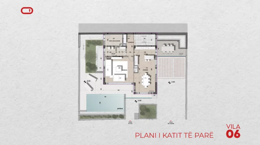 Kjo vilë 3-katëshe me sipërfaqe 342 m² ndërtim dhe 401.14 m² truall ofron hapësira të mëdha dhe funksionale.
