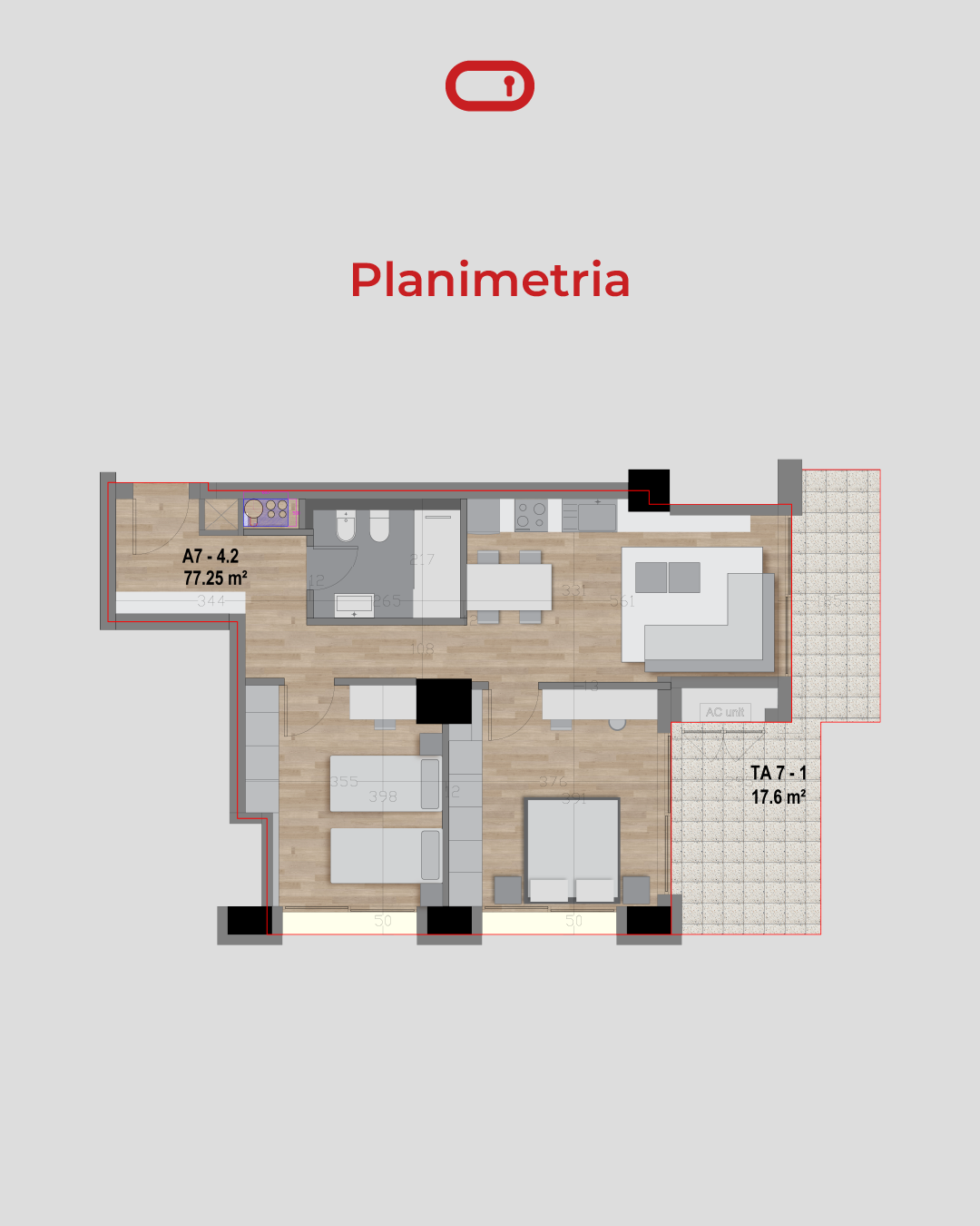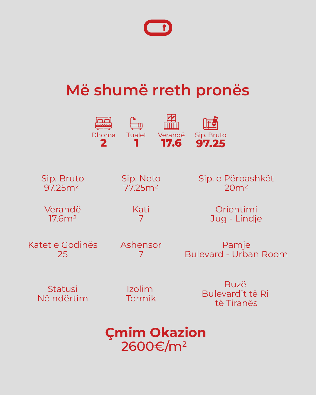 Njësia ka sipërfaqe bruto 97.25 m², sipërfaqe neto 77.25 m², sipërfaqe të përbashkët 20 m² dhe verandë 17.6 m².